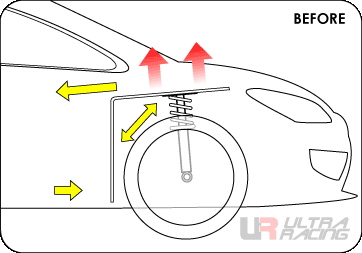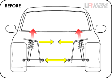 The installation of strut bars / Anti-Roll Bars are also essential when attempting to correct oversteering and/or understeering characteristics. As most modern cars go, car manufacturers employ the FF (Front engine, Front wheel drive) setup for improving driver and passenger safety. The natural behaviour of an FF car is to have a slight understeer, due to its heavier front end. Understeer happens when the front wheels lose their traction and won't turn any sharper, even when the steering is being corrected to turn the car more. This will cause the car to go wide instead of following the line. Understeer can be corrected by stiffening the rear end of the vehicle by adding a rear strut brace and a Rear Anti-Roll Bar.