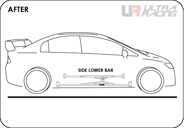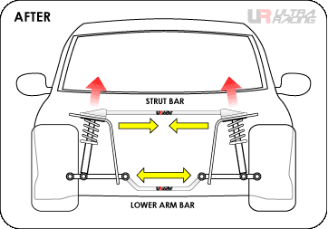 The installation of strut bars / Anti-Roll Bars are also essential when attempting to correct oversteering and/or understeering characteristics. As most modern cars go, car manufacturers employ the FF (Front engine, Front wheel drive) setup for improving driver and passenger safety. The natural behaviour of an FF car is to have a slight understeer, due to its heavier front end. Understeer happens when the front wheels lose their traction and won't turn any sharper, even when the steering is being corrected to turn the car more. This will cause the car to go wide instead of following the line. Understeer can be corrected by stiffening the rear end of the vehicle by adding a rear strut brace and a Rear Anti-Roll Bar.